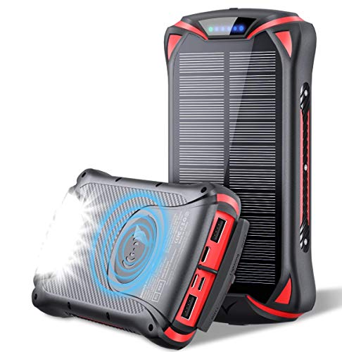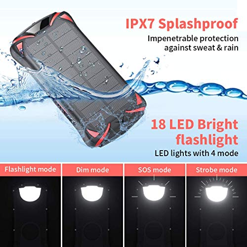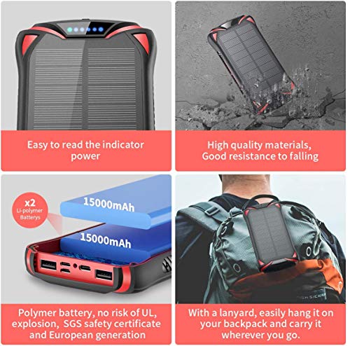 30000mAh Solar Power Charger: Solar battery charger built in 30000mAh battery, it’s enough to charge an iPhone 11 9 times, Samsung Galaxy S8 8 times, an Macbook Pro for 5 times! The 30000mAh solar charger keeps your phone fully charged, even during hurricanes and unexpected power outages.