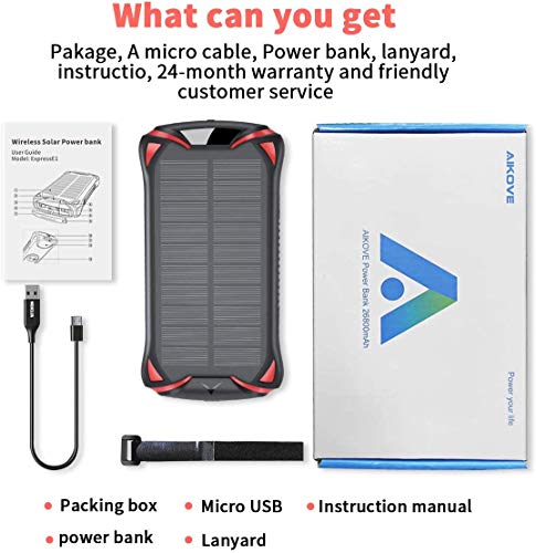 ABS Material & What You Get: Made of durable and reliable ABS PC Silicone material and Polymer Battery(the safest battery type so far), protects it from rain, dirt and shock / drops. Intelligent security protection, avoid over-current, over-voltage, over-load and short circuit, etc. What You Get: 1 Solar battery charger, 1 Instruction booklet, 1 Micro cable, 1 Sling, 36-month warranty, quick customer service★E-Mail: support@aikove.com★