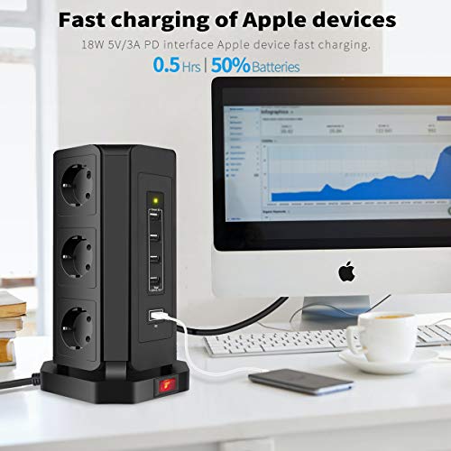 HOVNEE Steckdosenleiste Mehrfachsteckdose 9 Fach Steckdosenturm (2500W/10A) mit 4 USB-A und 1 USB-C Ladeanschlüsse und 2…