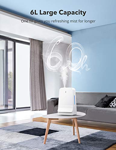 Massive 6L Kapazität: Mit seinem 6L Tank produziert der Cool Mist Luftbefeuchter 60h lang kontinuierlich Wassernebel, um die Luft in Räumen mit bis zu 40m²/430ft² zu befeuchten