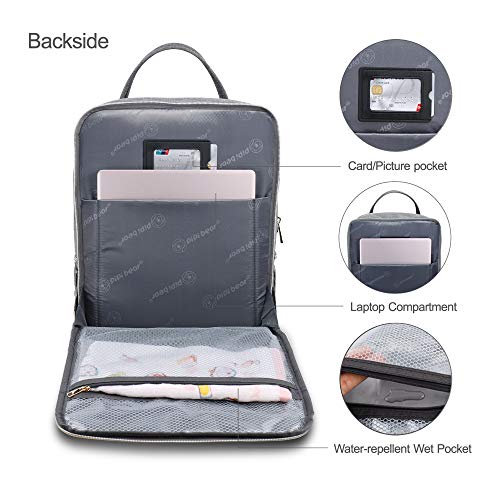 Ein ausreichend großes gepolstertes Fach auf der Rückseite der Wickeltasche bietet Platz für einen 15,6-Zoll-Laptop, einen Ordner, ein iPad oder sogar eine Wickelauflage.  Es gibt auch wasserdichte 40 x 28 cm große Fächer, in denen nasse Kleidung isoliert oder wichtige Unterlagen aufbewahrt werden können.